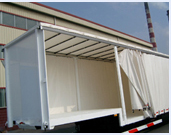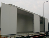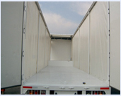 軟蓬氣墊車(長X寬X高,cm) 長×寬×高:1200×250×(前280鵝頸段為250;后920低板段為293),車廂后門可打開,兩側蓬布可由后向前或由前向后打開,頂部篷布可由后向前推開,使得裝卸作業既可使用鏟車,又可使用吊車,極其方便。 |